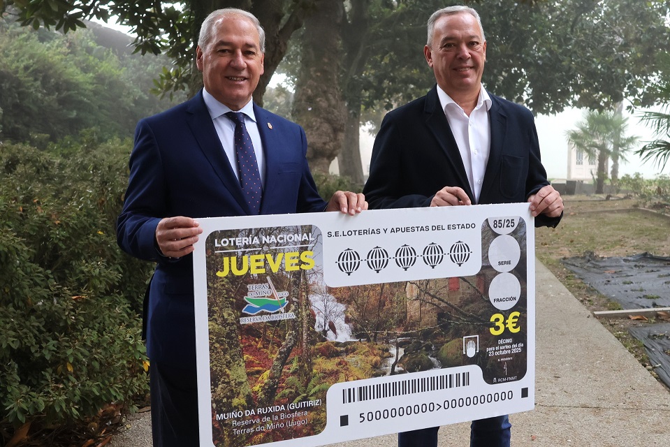 O Presidente da Deputación de Lugo, José Tomé Roca, e o Deputado de Medio Ambiente, Carlos López López, veñen de presentar a imaxe que protagonizará o boleto do sorteo da Lotería Nacional do próximo xoves 23 de outubro. O décimo inclúe unha fotografía dun enclave paisaxístico da Reserva da Biosfera Terras do Miño concretamente, do Muíño da Ruxida situado no concello de Guitiriz.