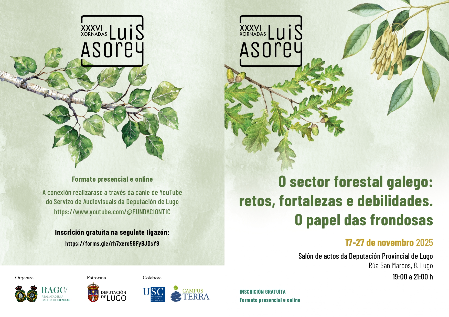 O Salón de Actos do Pazo de San Marcos acollerá a celebración das XXXVI Xornadas Luis Asorey que se celebrarán entre os días 17 e 27 de novembro e que este ano se centrarán no sector forestal galego: os retos, as fortalezas, as debilidades e o papel das frondosas. O evento, organizado pola Real Academia Galega de Ciencias da man da Universidade de Santiago de Compostela, conta co patrocinio da institución provincial que realiza unha achega económica de 5.000€ e, ademais, colabora coa difusión do evento que poderá seguirse en directo a través da canle de Youtube do Servizo de Audiovisuais da Deputación de Lugo.